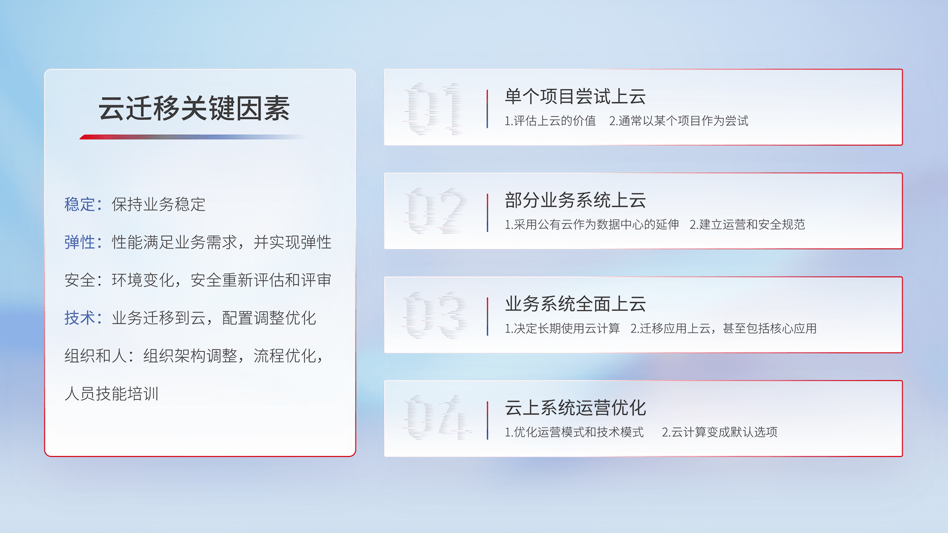 结合实际业务,,,,从规划设计、、、、云平台选型、、云原生改造、、、、数据迁移、、集成交付,,,,迁移全过程为客户识别最佳上云路径,,,,做好风险识别管理,,设计网络架构、、身份权限、、、安全审计合规、、、、操作审计、、、、日志审计、、监控告警策略、、多站点容灾设计等,,对云上基础设施进行整体规划,,提升IT治理水平,,以满足弹性、、、、高可用、、高性能的需求。。