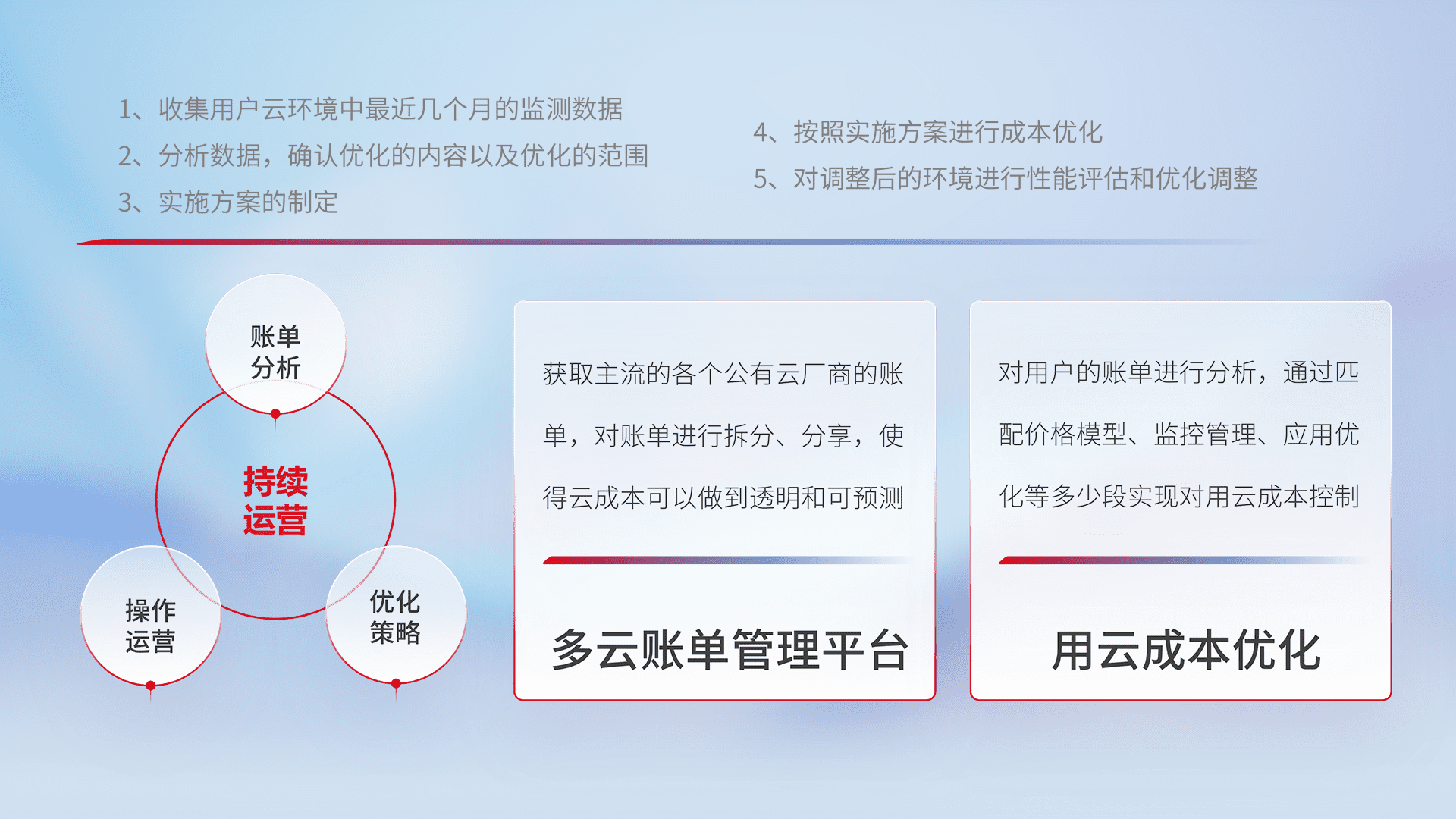 通过多云纳管,,,,以统一的资源数据模型把客户的云资源进行抽象和封装,,进而实现对多云资源的统一操作,,保障云资源管理的可靠性、、、、稳定性与可用性。。。。量身定制化运维内容,,,配置、、、开发运维、、、、补丁管理、、、、备份、、、监控、、、、认证和访问管理、、审计和日常巡检等,,,保障在用云过程中的可靠度,,稳定度以及高可用率。。。